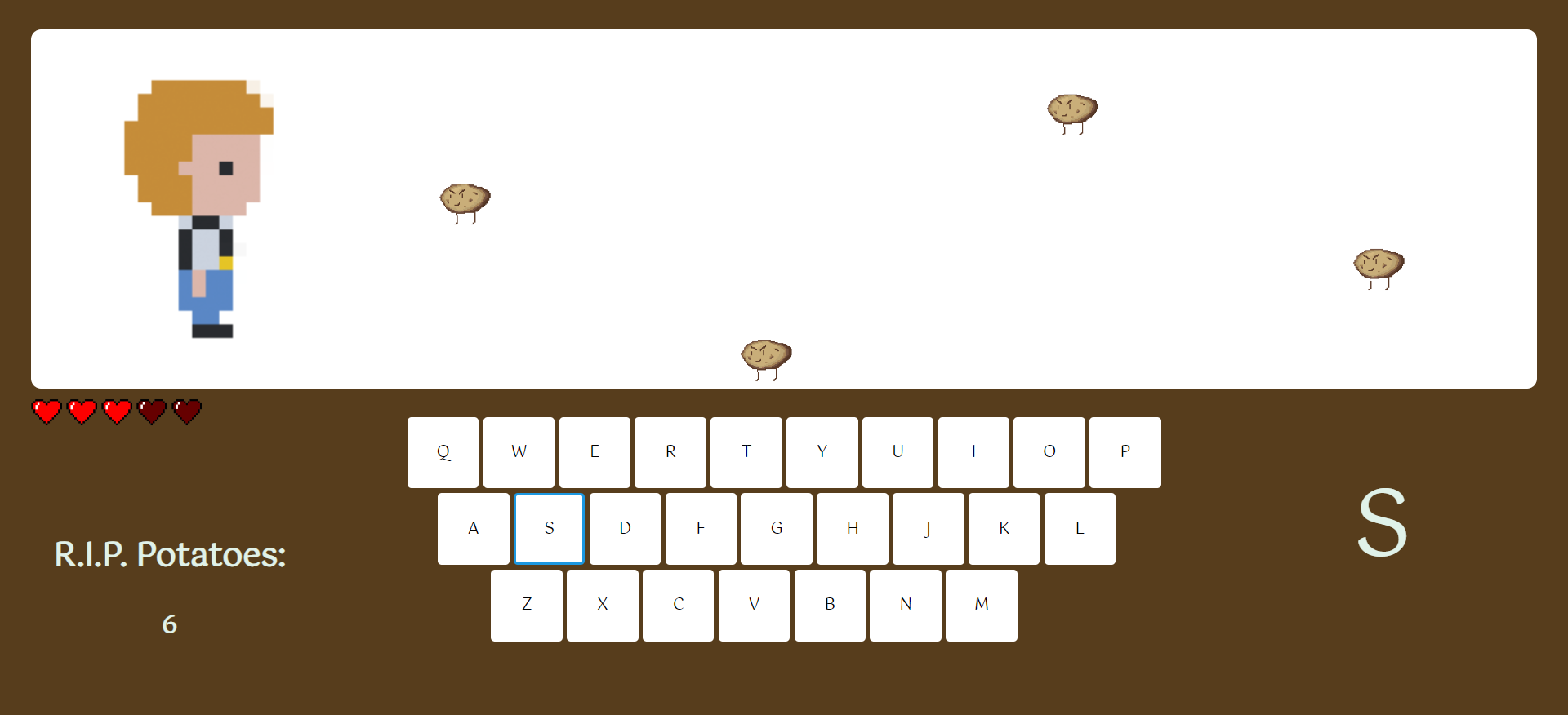 The gameplay involves contending with a horde of potatoes that advance towards the player’s character. To thwart the impending potato onslaught, players must swiftly type the corresponding key on their keyboard to disintegrate the potatoes. Failing to input the correct key or allowing a potato to reach the character results in the loss of a life. If all lives are depleted, the player loses the game.